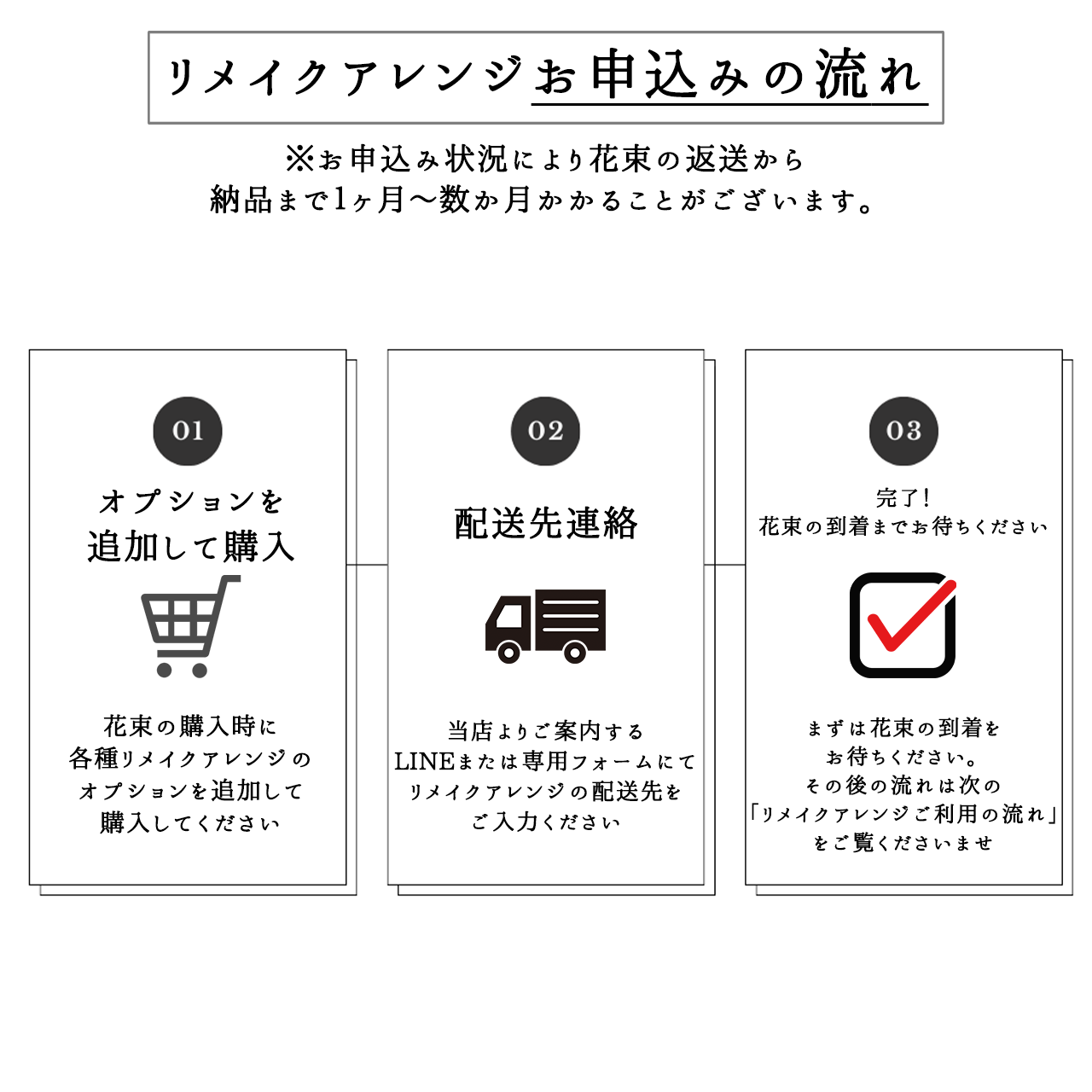 ご自宅で飾りやすいかたちにリメイクしてお届け致します。